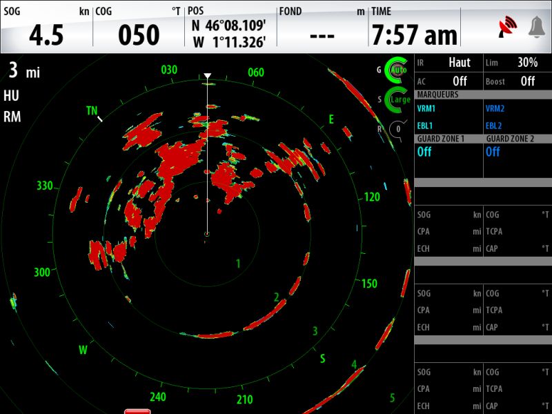 En modo normal de utilización, el barco está en el centro de la pantalla, para medir el rumbo y la distancia de un objetivo con relación al barco, se utilizan el VRM (circulo variable) y el EBL (alidada móvil).